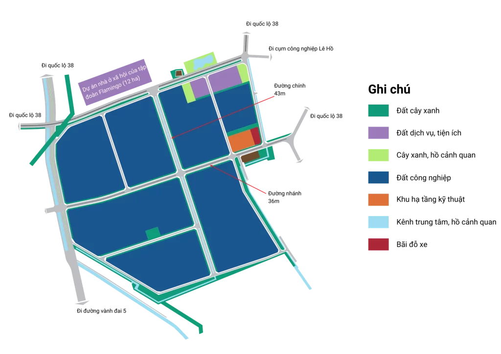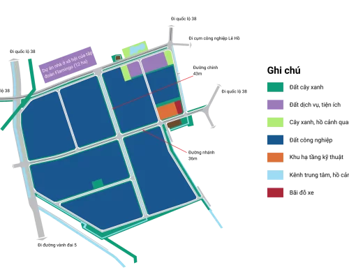 | Giao thông nội khu: | Tuyến đường chính rộng 43 m, tuyến đường 36 m |