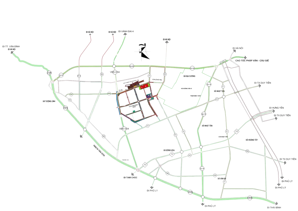 - Tuyến đường chính rộng 43 m theo hướng Bắc – Nam dự án