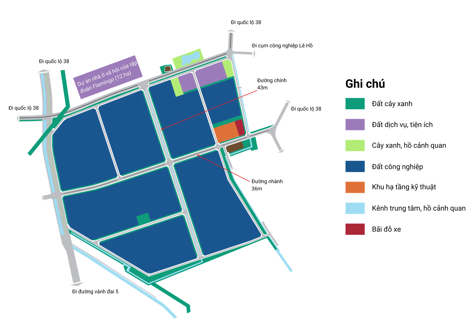 | Giao thông nội khu: | Tuyến đường chính rộng 43 m, tuyến đường 36 m |